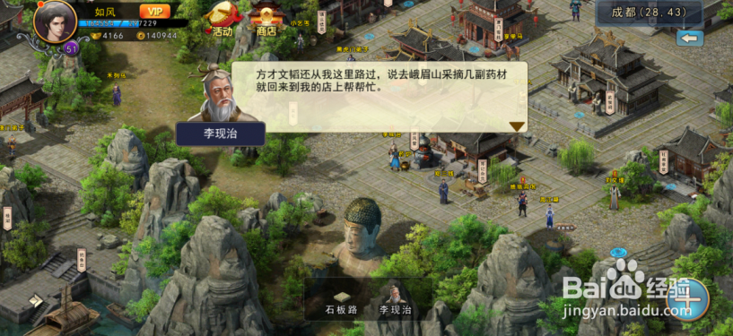 1、触发招募文韬任务后前往成都场景的28.43坐标点位置跟李现治进行对话,选择【文鸯后人】选项,这时李现治会讲述文韬去峨眉山采集药材的信息。