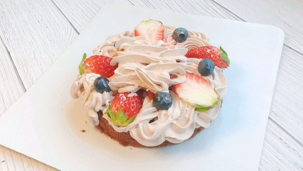 32、成品图。(直接打发的淡奶油稳定性差,室温太高极易融化,我拍照的时候,已经有点塌下来了,建议装饰好先放冰箱冷藏一会。)