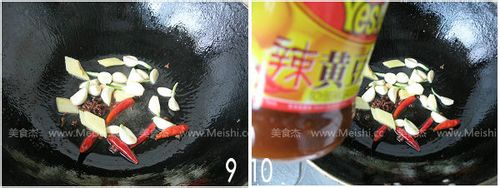 5、锅底留少许油,下花椒八角白芷干辣椒炸香