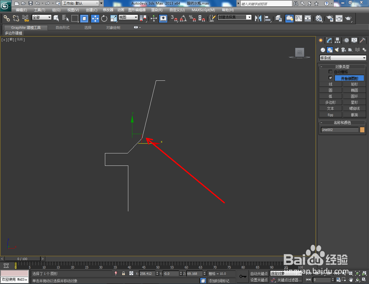 2、点击【创建】-【图形】-【线】,绘制一条多段线后,点击【顶点】图标,按图示对线上的节点进行平滑圆化处理;