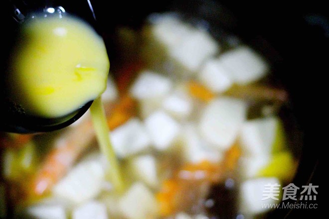 14、淀粉用30克清水化开、慢慢倒入锅中、用勺子搅拌均匀