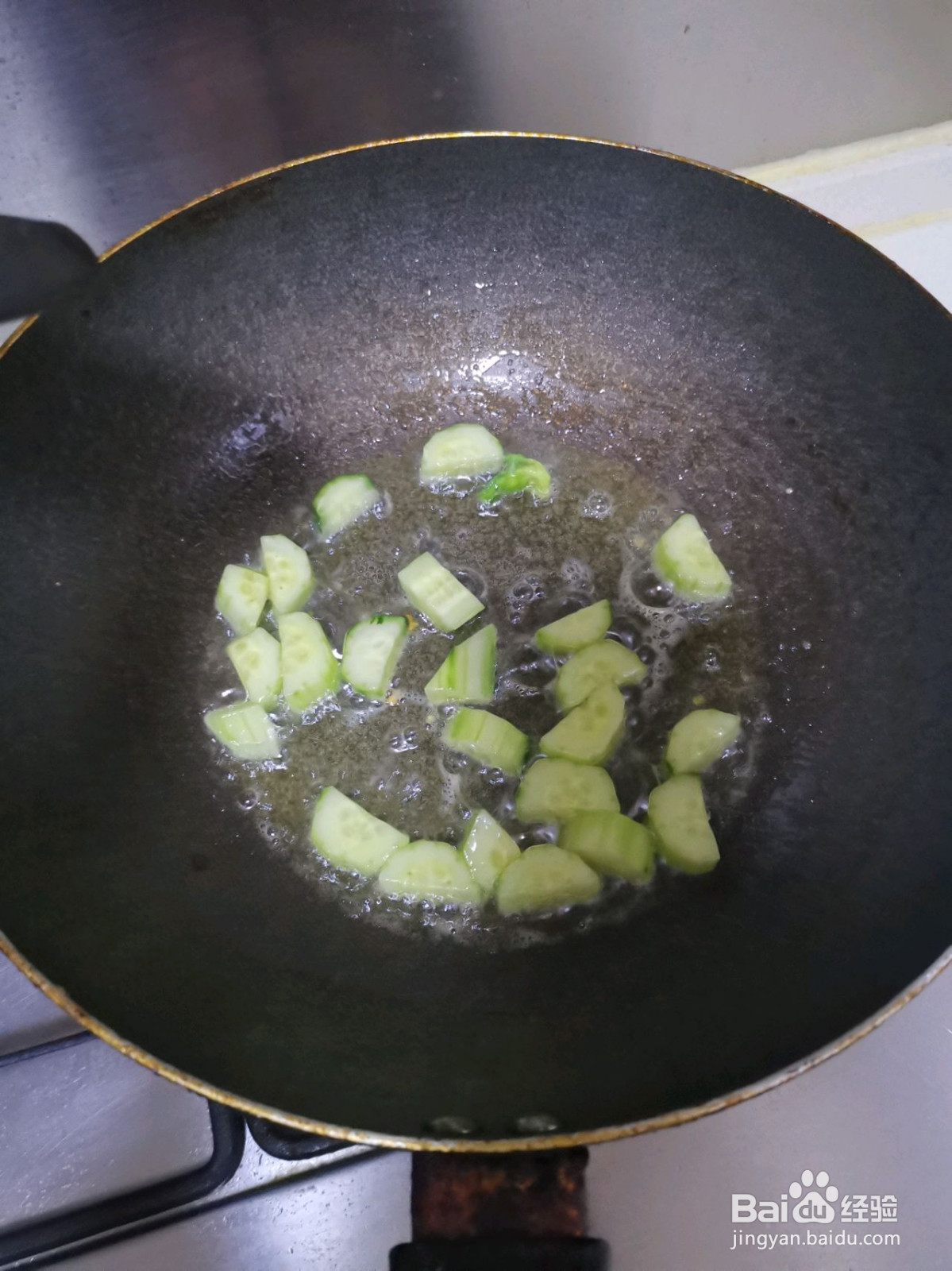 7、锅少量油,放入蒜炝锅后把青椒红椒木耳黄瓜一并放入炒片刻