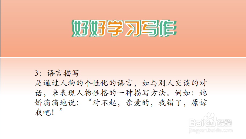 是通过人物的个性化的语言,如与别人交谈的对话,来表现人物性格的一种描写方法。例如:她娇滴滴地说:“对不起,亲爱的,我错了,原谅我吧!”