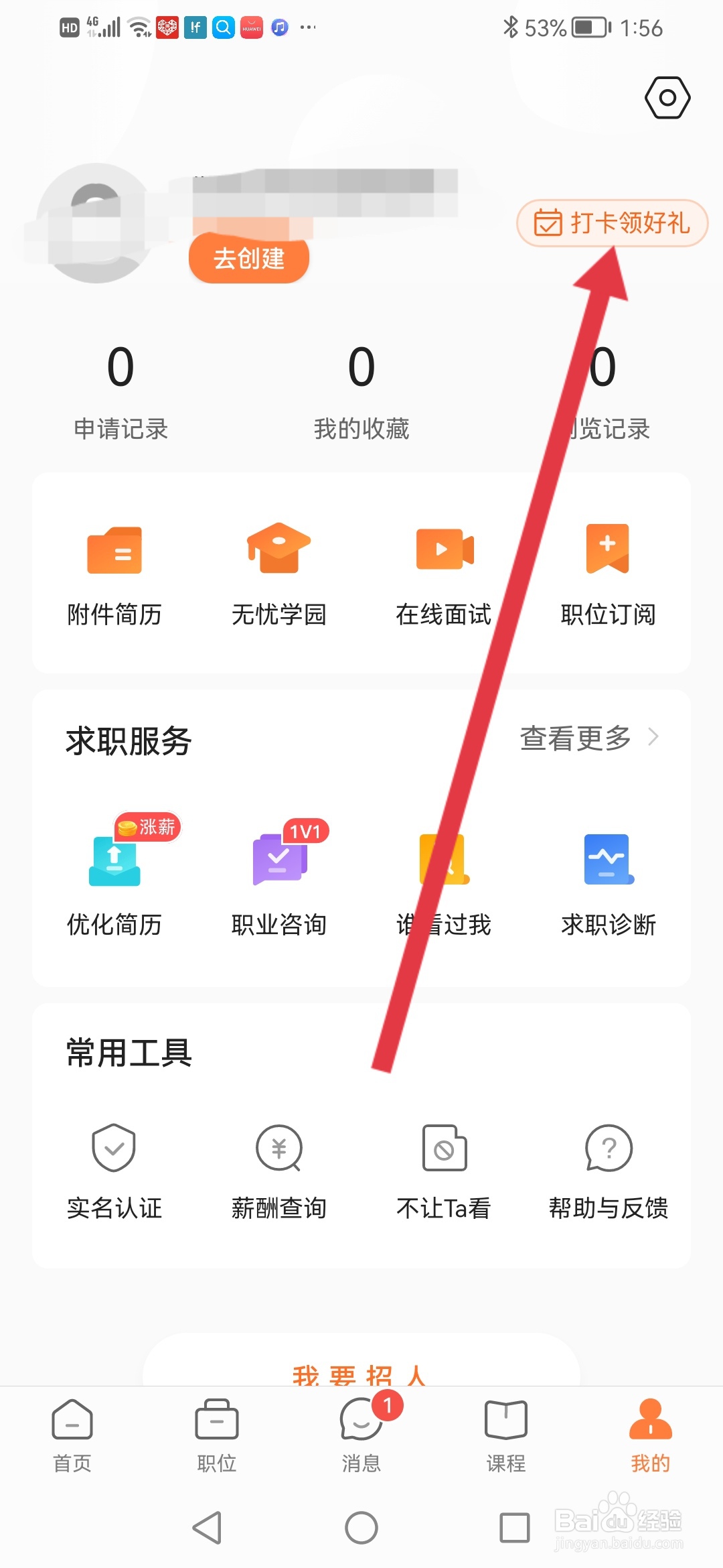 3、来到个人中心,点击【打卡领好礼】。