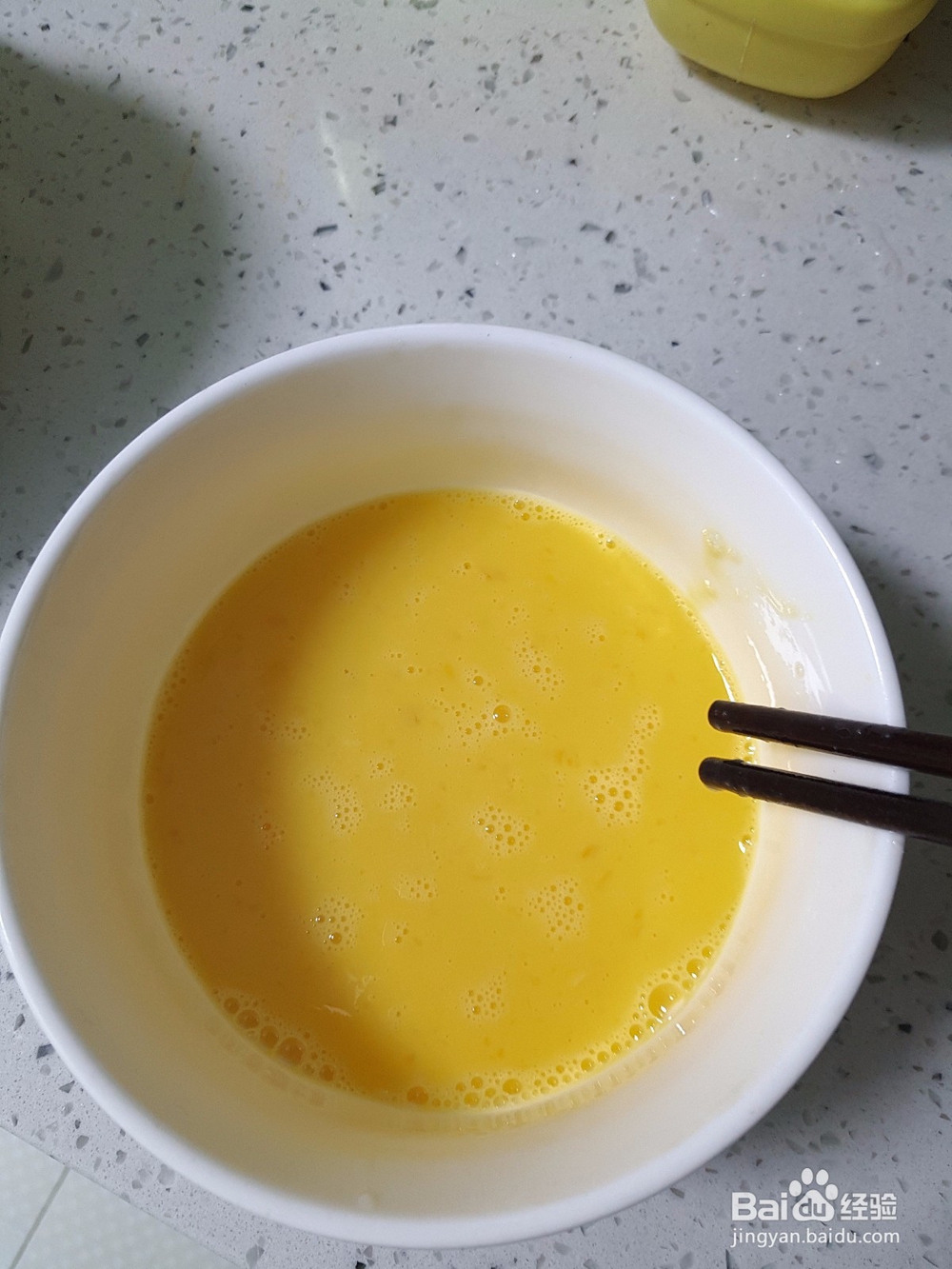 2、将鸡蛋倒入碗里,顺着一个方向搅拌,搅拌只气泡慢慢消散;