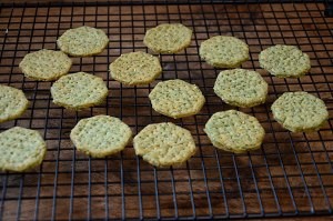 9、用叉子在饼干上均匀的叉孔,防止烤制的时候饼干变形。将饼干送入烤箱,中层160度,上下火,烤制15分钟左右。烤好的饼干马上取出晾晾。