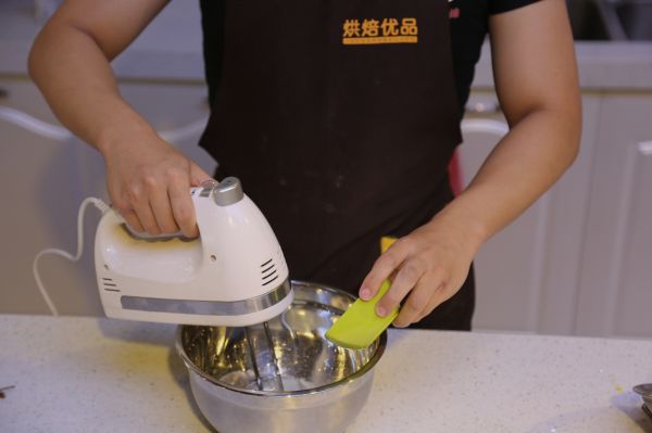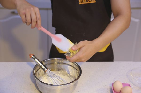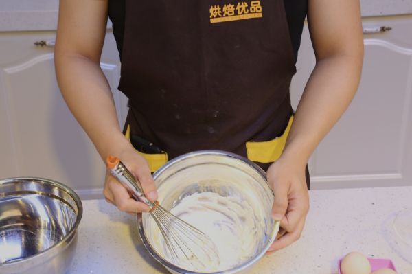 9、9.将打发好的蛋白取三分之一加入到蛋黄奶酪糊,翻拌均匀。再将将拌好的蛋白蛋黄奶酪糊倒回剩下的蛋白里,翻拌均匀。