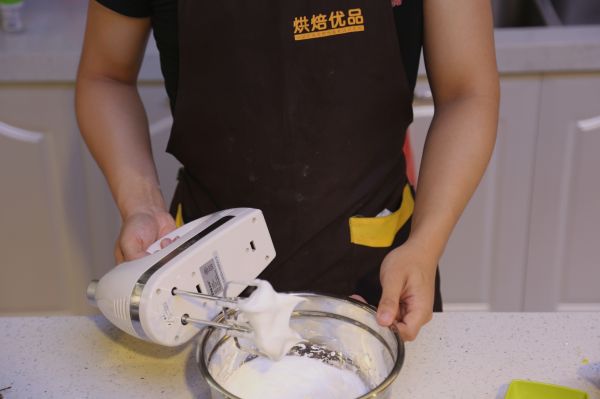 7、7.蛋白加入几滴柠檬汁,分三次加入细砂糖