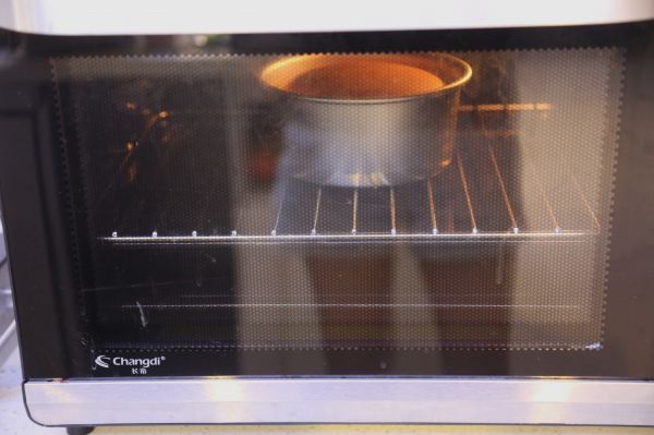 11、11.放入预热好的烤箱中下层,在最底下放一个装了一半水的烤盘。220度烤10分钟,,再140度烤50分钟,烤完后不要马上拿出来,在烤箱内焖30分钟。