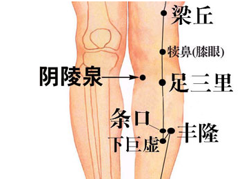 【定位】:小腿内侧,阡狻浼噙胫骨内侧下缘与胫骨内侧缘之间的凹陷中。