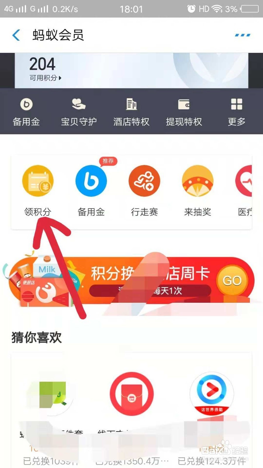 2、进入蚂蚁会员页面,选择领积分快捷图标
