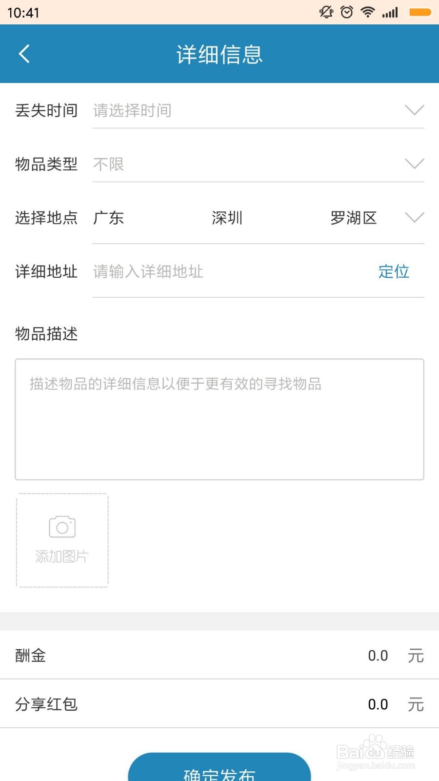 登录丢丢后,发布寻物启事,详尽的填写时间地点,信息量越丰富,找回可能性越大。