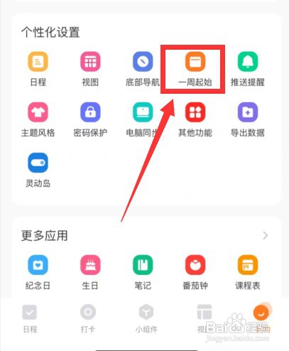 2、在我的页面,个性化设置下,找到并点击“一周起始”。