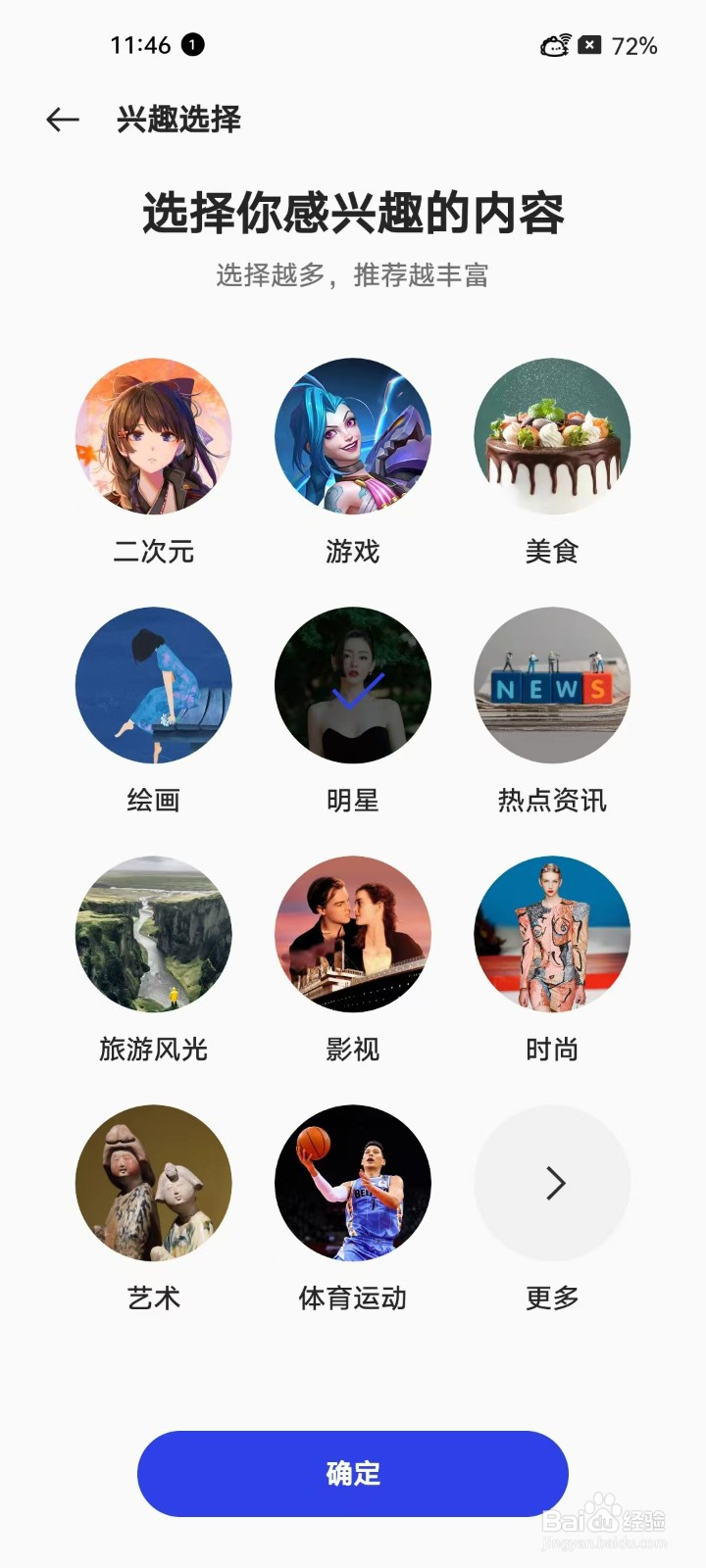 2、点击右上角设置按钮,找到“兴趣选择”点击即可;勾选感兴趣的内容点击“确定”。