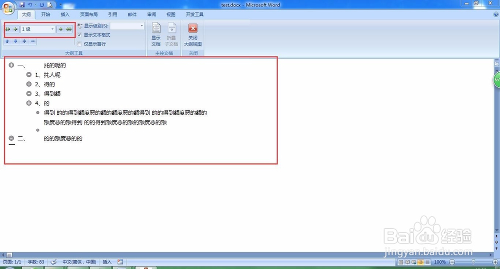 在大纲视图模式下,非常清晰地标注着各级级域。我们可以选择文字,然后依次注明该文字是第几级别,可以用数字1,2,3,.......来分别表示是第一、二、三.......级别的。