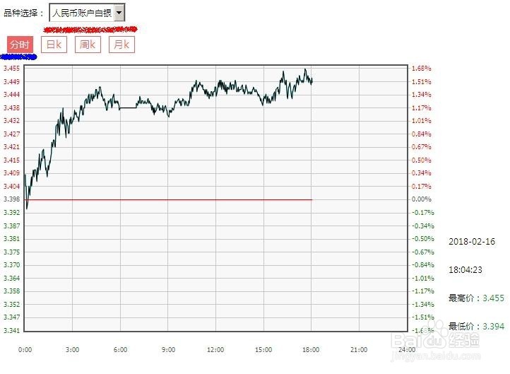 在账户贵金属各品种实时行情列表上,点击某一品种的“走势图”,就打开这一品种的“分时图”。
