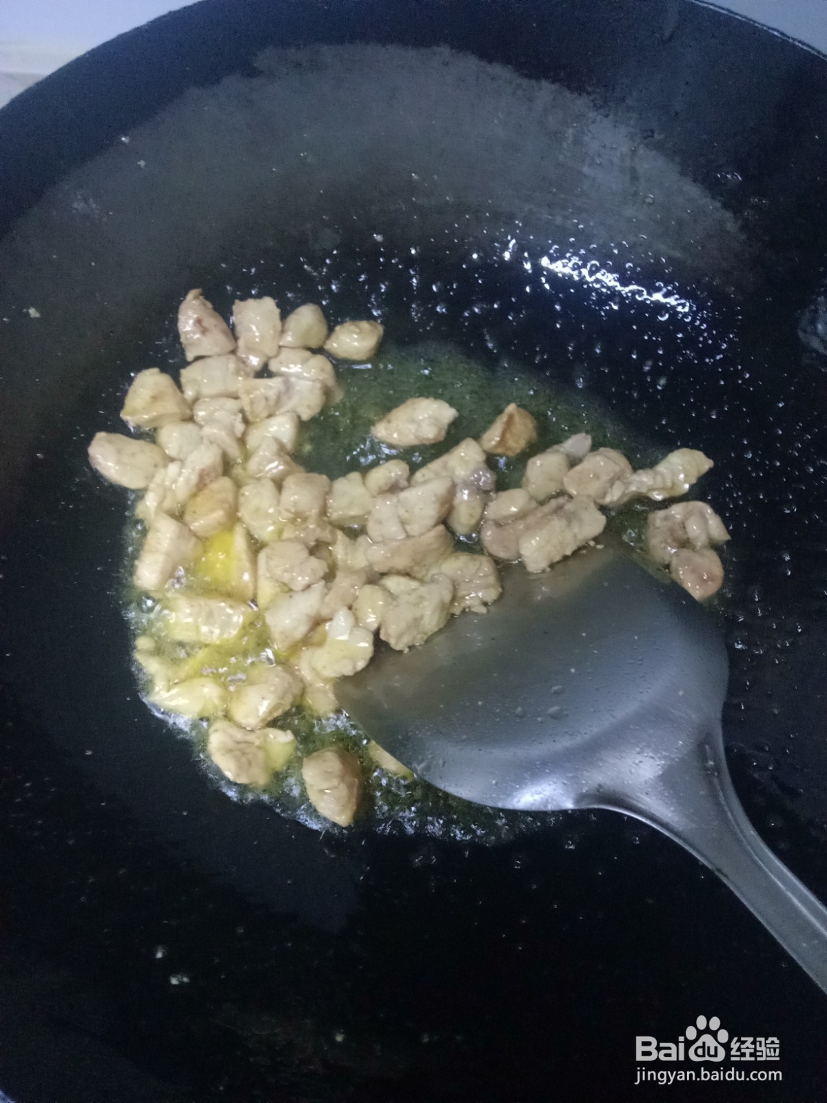 3、炒锅预热后加入适量的油,油温升起后倒入鸡肉,翻炒至变色后倒入蒜,翻炒出香味。接着加入莴苣叶,翻炒几下后调入适量的盐、南德、生抽翻炒均匀。然后翻炒一会,菜熟透就可以盛出装盘了。