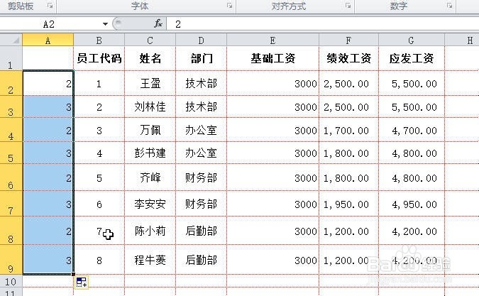 3、按住【Shift】键的同时选中单元格A2和A3,将鼠标指针放置在单元格区域的右下角,利用自动填充柄功能,并且在按下【Ctrl】键的同时向下拖动鼠标,在单元格中填充数据,如图所示。