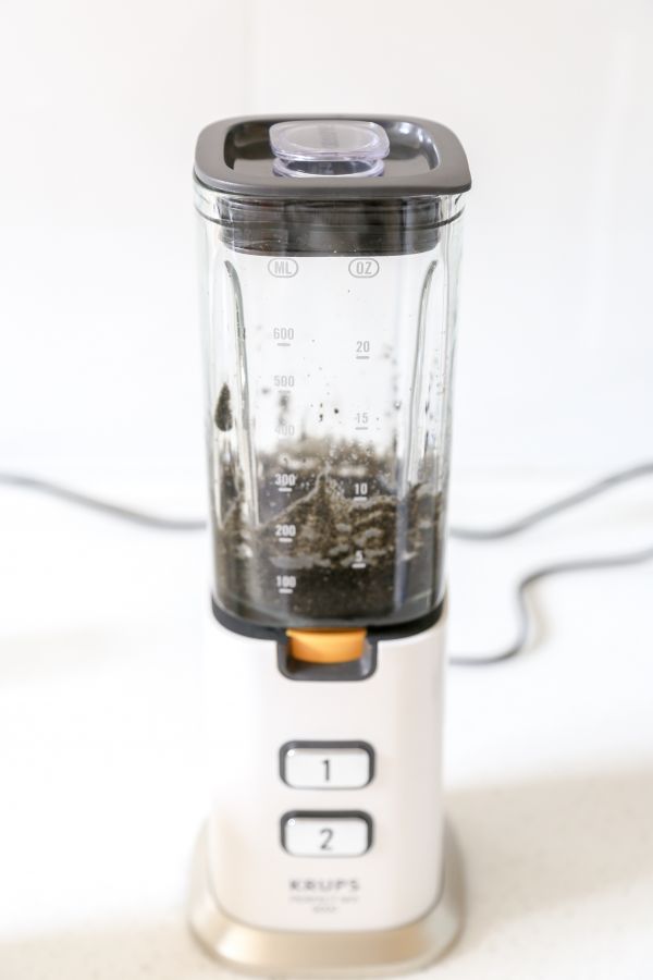 4、将炒熟的黑芝麻晾凉,放入搅拌机中打成粉PS. 一定要将黑芝麻晾凉再放入搅拌机中,否则湿气太重会搅打成团