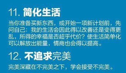 当你准备买新东西的,或开始一项新的计划前,先问自己:我的生活会因此改善还是变得更乱,所得的幸福是否超乎代价?使生活简单化可以解放出能量,情商也会得以提高。