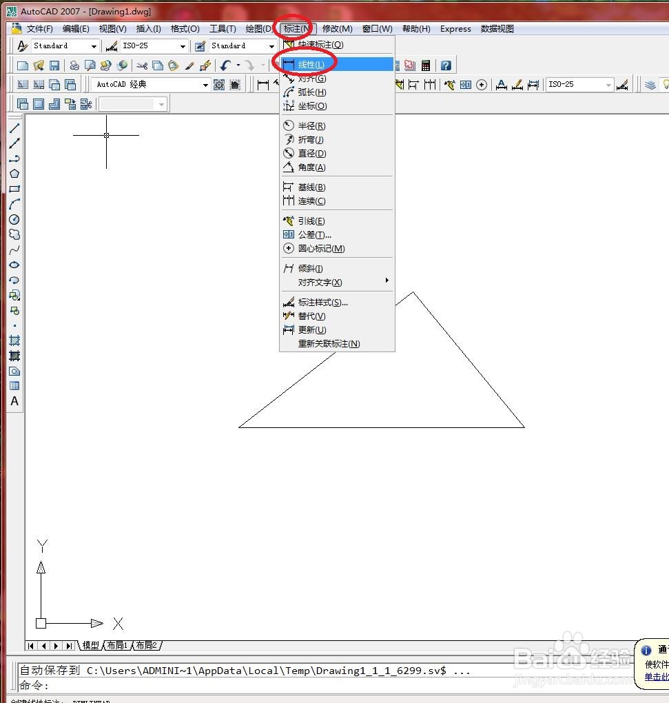 3、根据命令行提示在绘图区域内指定第一条尺寸界线的原点,如下图所示
