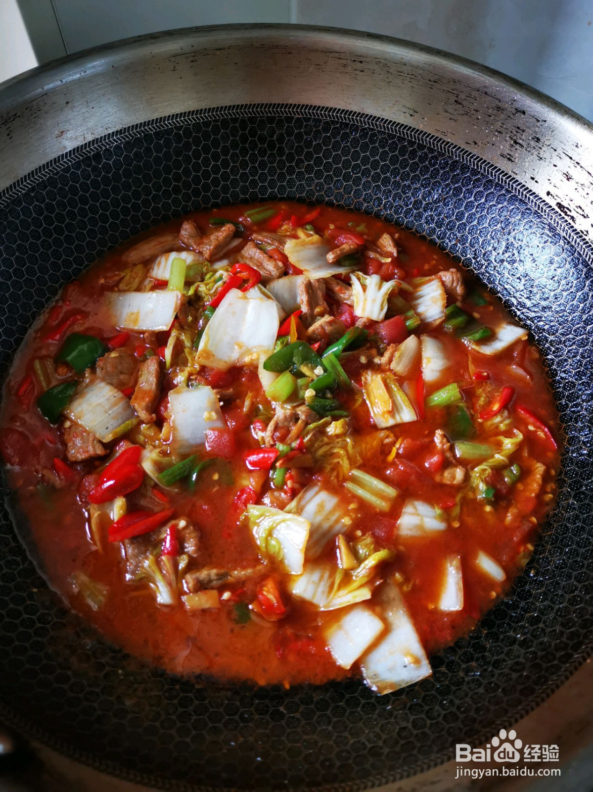 9、锅内炒牛肉的油放入葱姜蒜炝锅,然后倒入白菜,青椒,芹菜,翻炒片刻倒入西红柿,继续翻炒片刻倒入牛肉,此时调入:盐,生抽,耗油继续翻炒,待西红柿汁水炒的丰满时,关火调少许味精,成品便好了。