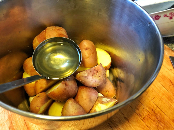 4、煮好的小土豆和切好的大蒜放在容器内加入一汤勺植物油轻轻搅拌均匀。
