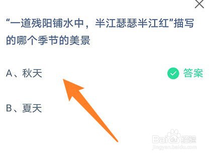 3、蚂蚁返窑詹儋庄园(9月27日)问题二:“一道残阳铺水中,半江瑟瑟半江红”描写的哪个季节的美景? A、秋天 B、夏天 正确选项是:(A、秋天)