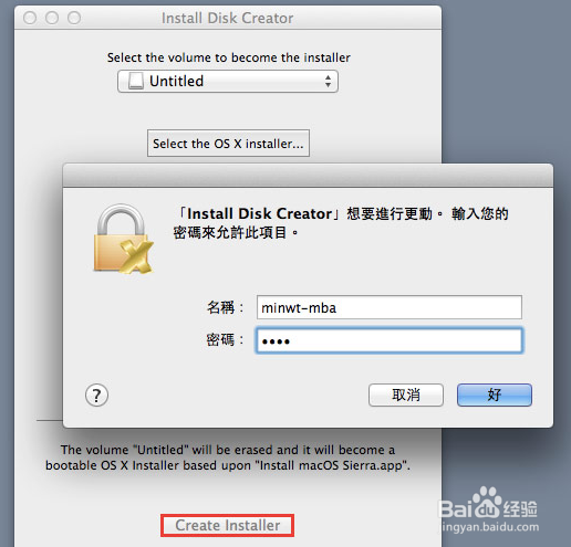 4、选好后,再按下方的Create Installer钮,并输入计算机的管理者帐密。