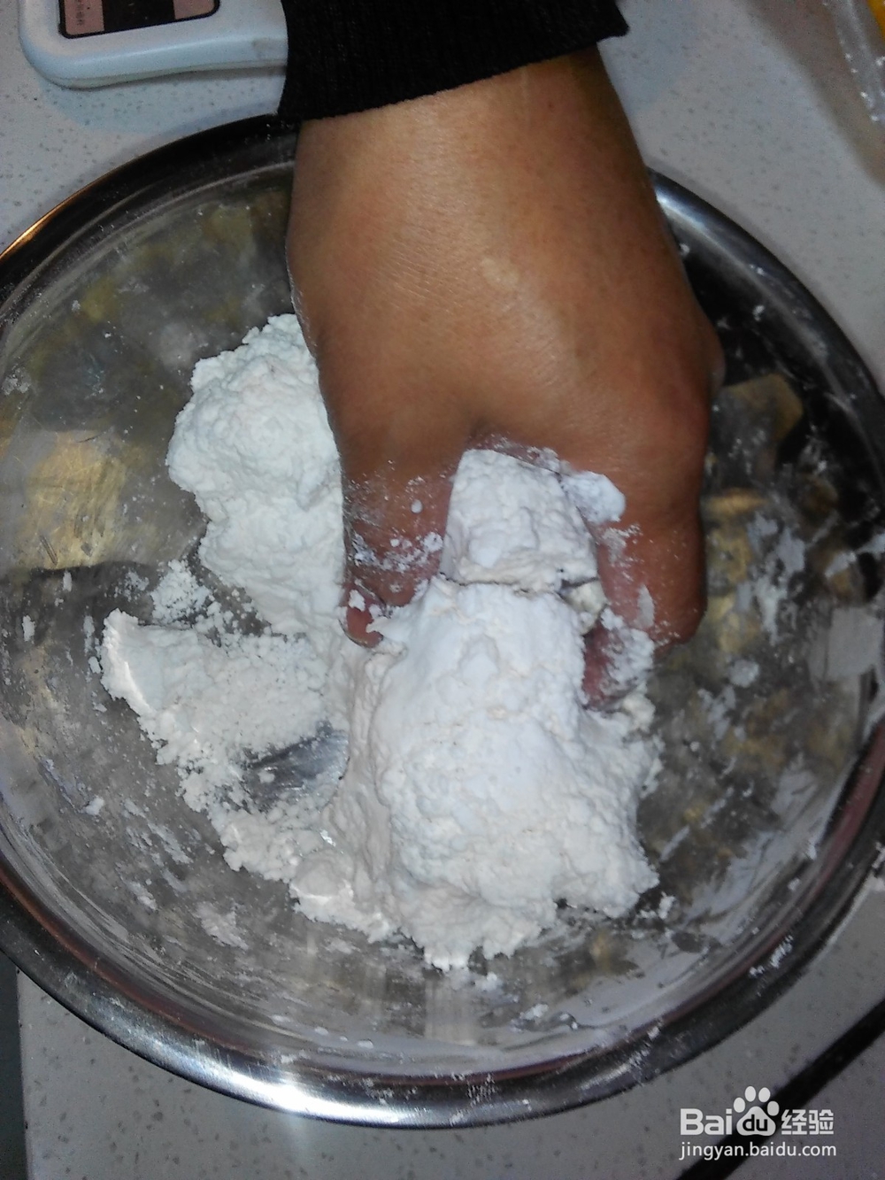 6、然后将猪油倒入搅拌好的黑芝麻白糖中,用清洗干净的手将它们捏成混合的馅料团备用