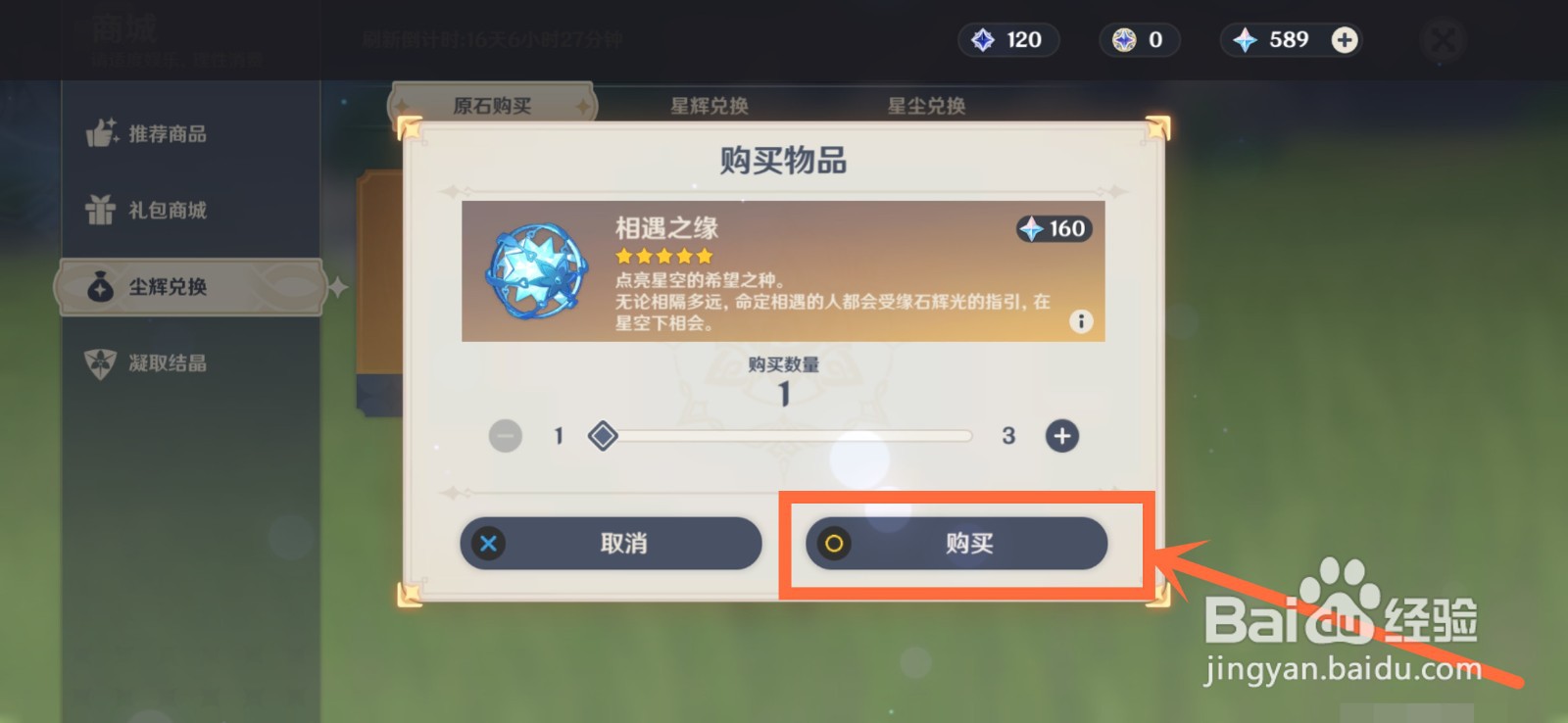 6、进入购买物品界面后,点击【购买】使用原石即可。这样原神原石就购买物品使用了。如下图所示
