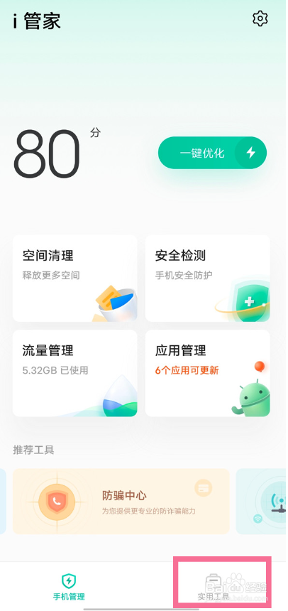 1、首先我们打开vivo手机的i管家,点击下方的实用工具。