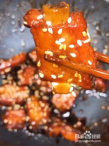 6、继续翻炒,一直炒的汤汁都少了,然后撒上芝麻。一道糖醋排骨就做好了。这样做的糖醋排骨味道鲜美十分好吃。