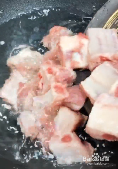 1、把排骨洗净,然后在锅里加入清水,将排骨放入锅里,接着下入,料酒、葱、姜。然后煮至沸腾,把排骨捞出备用。这就是焯水完成了。