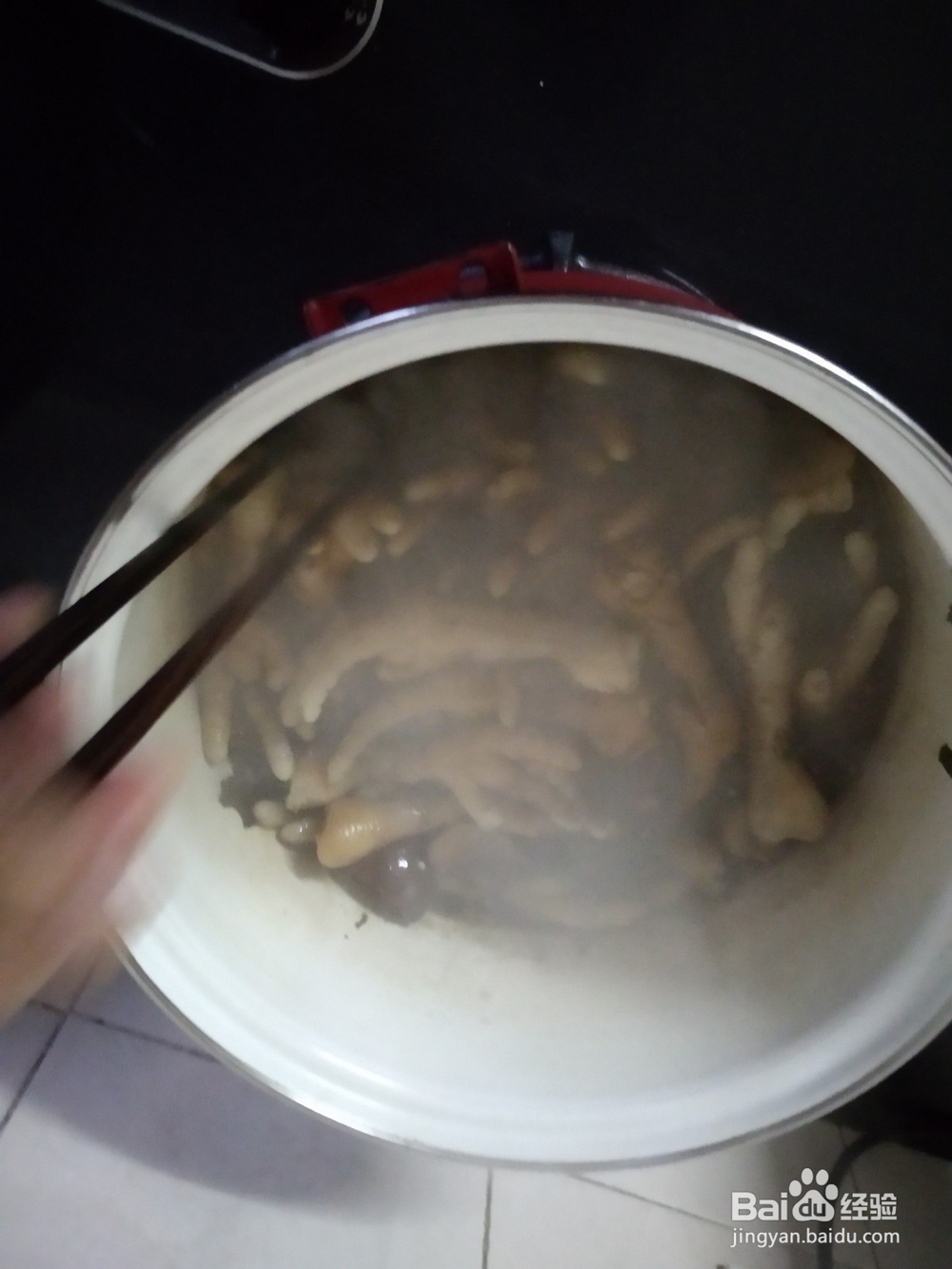5、倒去上面的混汤和浮沫,把鸡爪用水清洗干净