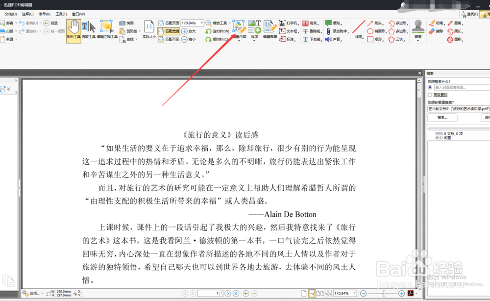 3、界面上找到“内容编辑”按钮,放大之后很好找,一眼就看到了,下面用箭头给大家标注出来了,无论是编辑PDF文件中的文字还是图片都需要点击这个按钮哦。