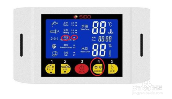 4、按一下保温/增压键,在我们的温度到达我们想要的温度,就可以保持这个温度,防止过冷或者过热,这样洗澡就很舒服了。