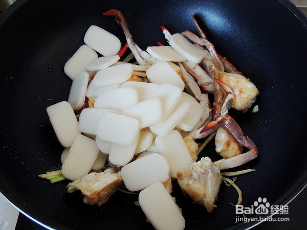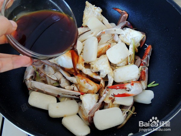 13、后将事先准备好的料汁倒入锅中,盖上锅盖,焖煮几分钟,让年糕和梭子蟹入味。可以尝一下咸淡是否合适。