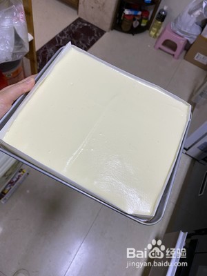 3、分三分之一到蛋黄煳,J字法搅拌,搅拌大致均匀倒入蛋白煳继续J法拌,拌匀后倒入模具。 我自己用的是叠的纸模21×20左右。