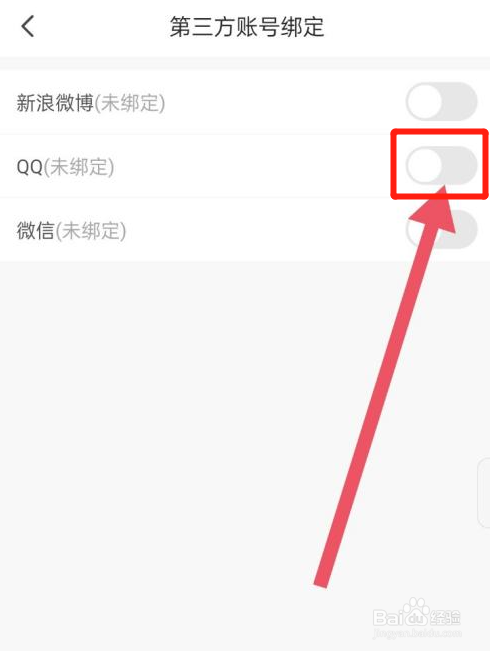 5、第五步;在界面中找到QQ。可以看到显示未绑定