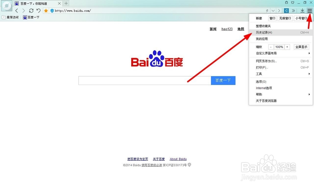 1、打开百度浏览器,点击右上角的标识,选择历史记录。