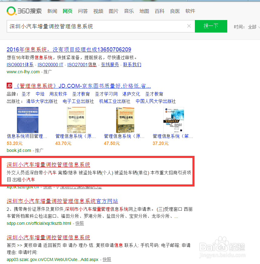 1、 打开IE浏览器,输入“深圳小汽车增量调控管理信息系统”,点击搜索,结果如下图所示;