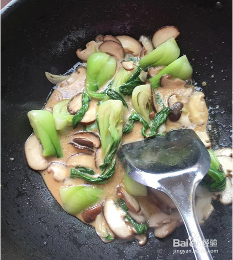 7、加入提前准备的酱汁(淀粉+水+酱油)和盐,翻炒均匀