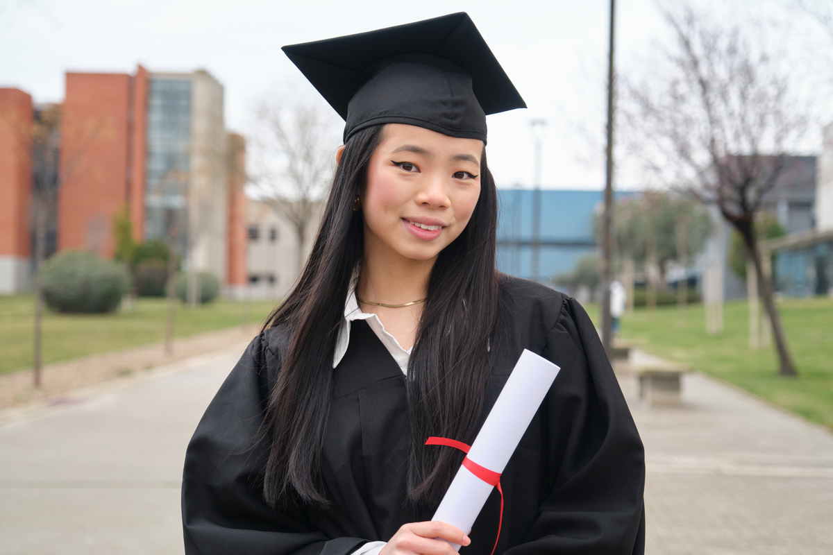 学校手拿博士帽的女学生背影