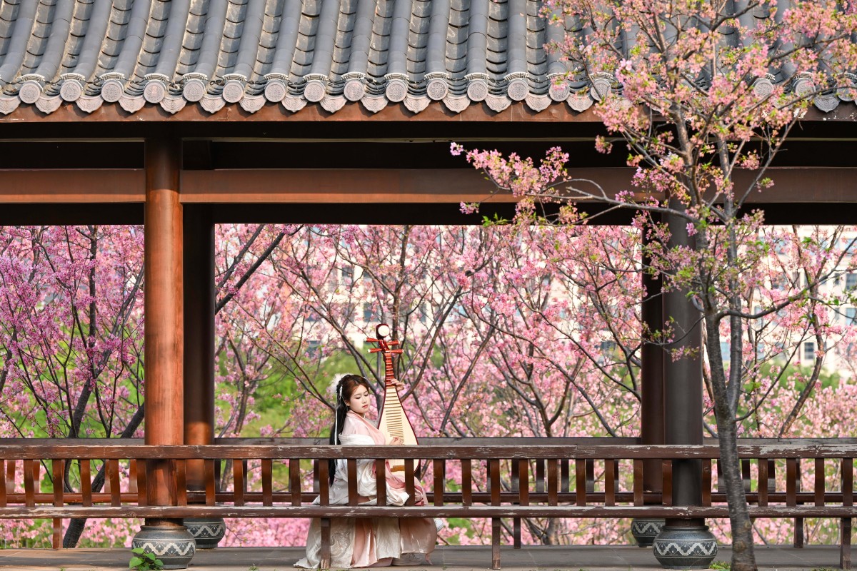 樱花树下,古装女子轻倚窗棂,望向远方,仿佛能听见古都的喧嚣与静谧.