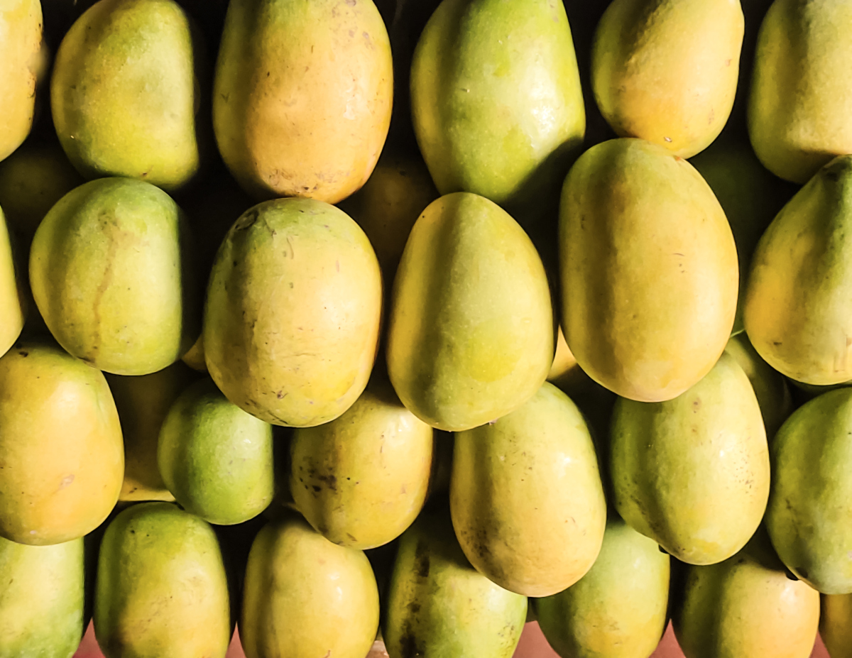 阳光倾洒而下,芒果闪烁着迷人的光泽,仿佛璀璨的宝石.